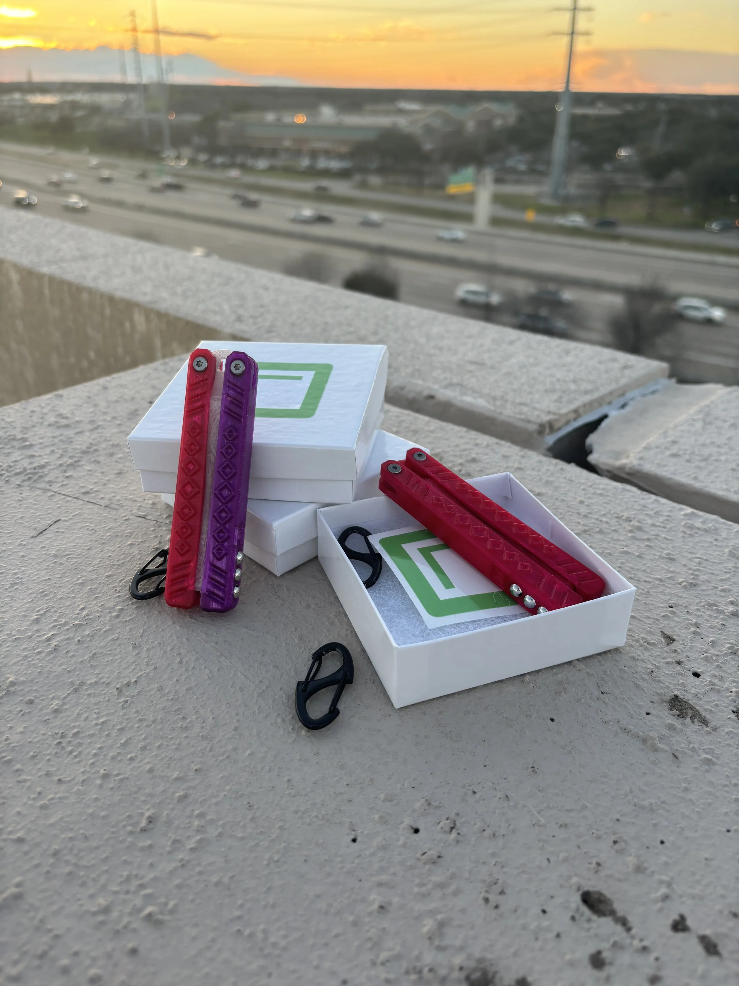 FidgetFly was a small business I started near the end of my Junior year of high school which offered 3D printed, mini butterfly knife trainers, ideal for fidgeting in any circumstance. This product filled a gap in the market since all trainers previously on the market were large and/or visually resemblant of a real knife (see picture to the left). My product aimed to be almost unrecognizable as something related to butterfly knives to typical bystanders while maintaining the ability for advanced hobbyists to have a fun and unique experince.