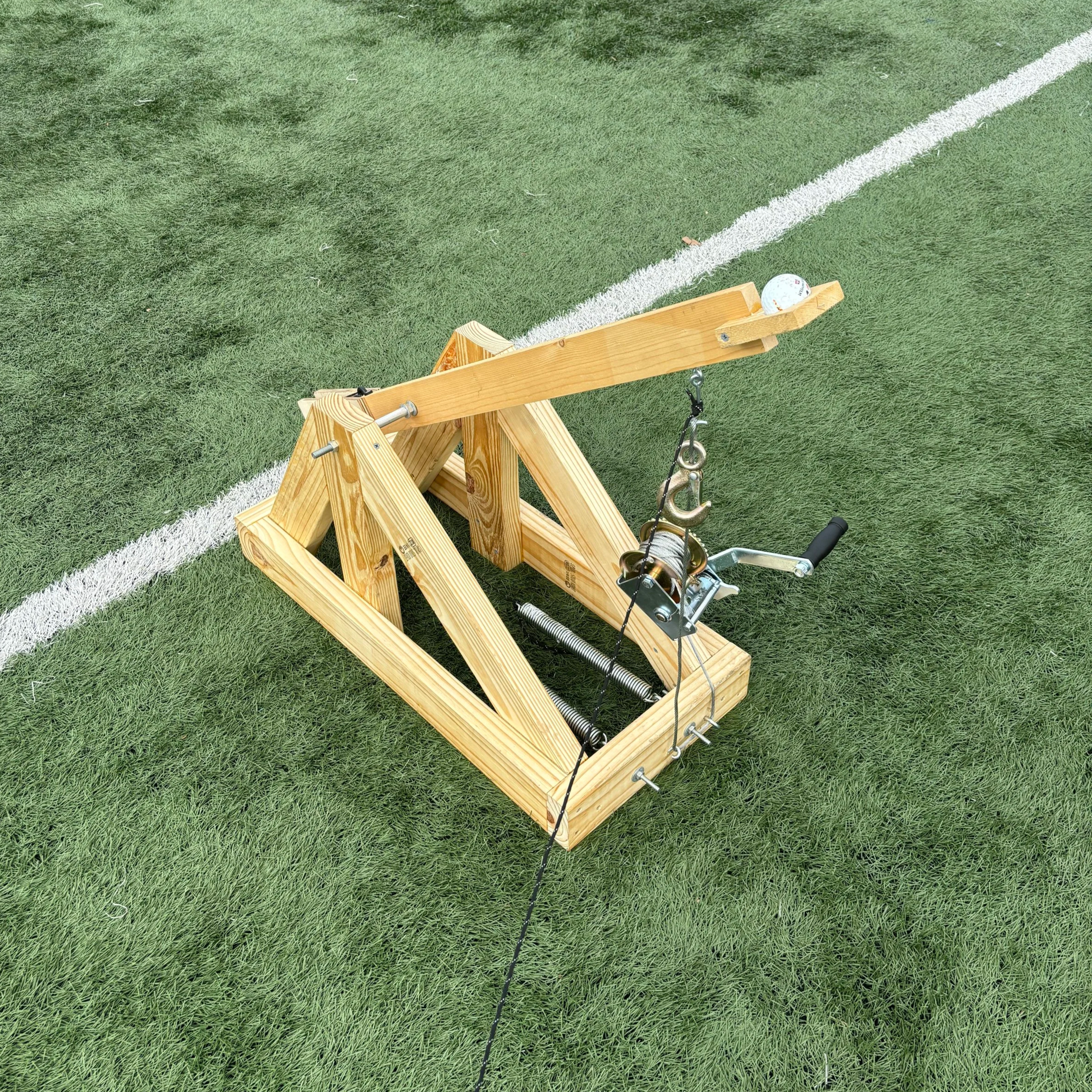 This was my final and most impressive design, using a wood frame, hand winch, and proper hardware to launch a golfball over 150ft, once again securing first place in its division. I was able to use my prior knowledge and thoughtful CAD to generate detailed plans and build a highly effective device.